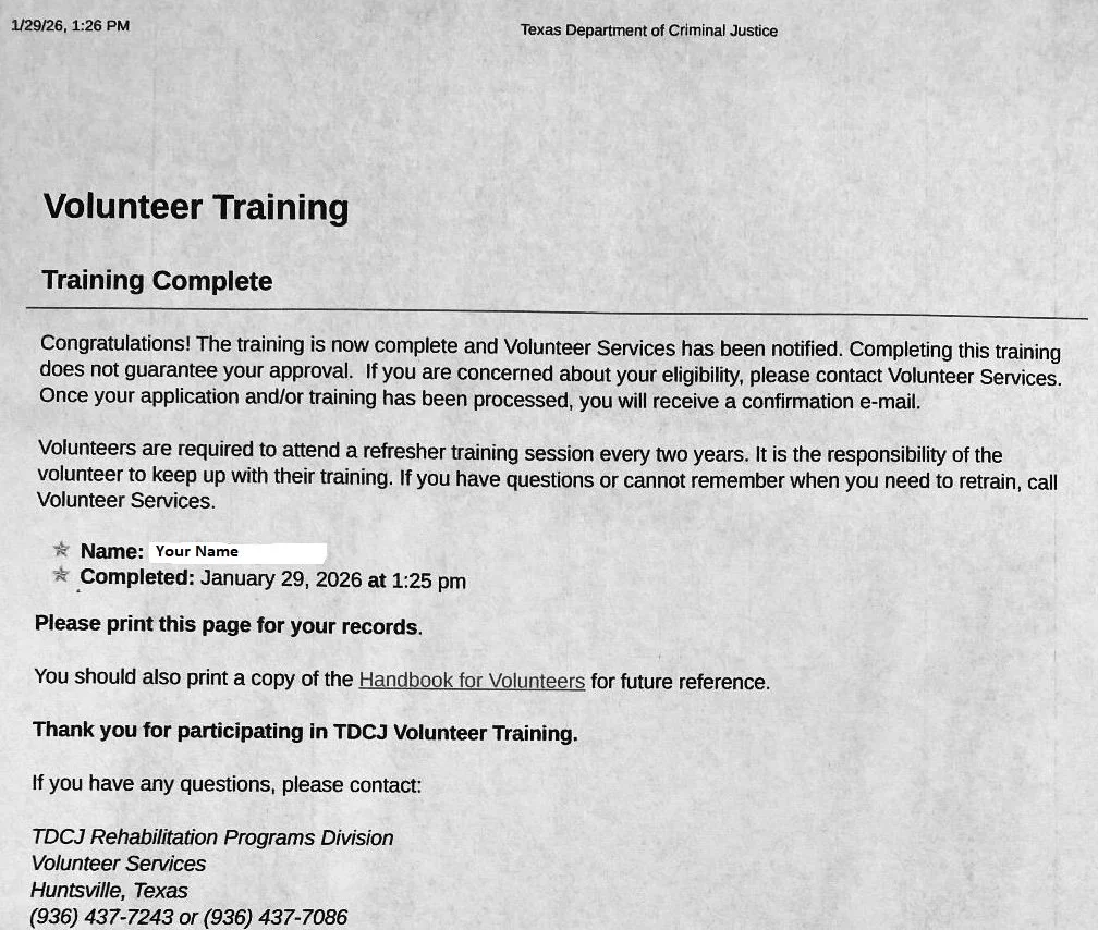Step #2: Complete Your TDCJ Volunteer Training(When complete, note Training Date)