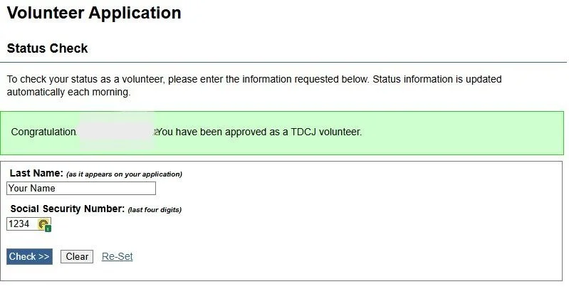 There are three simple steps to be approved as a Volunteer by the TDCJ: