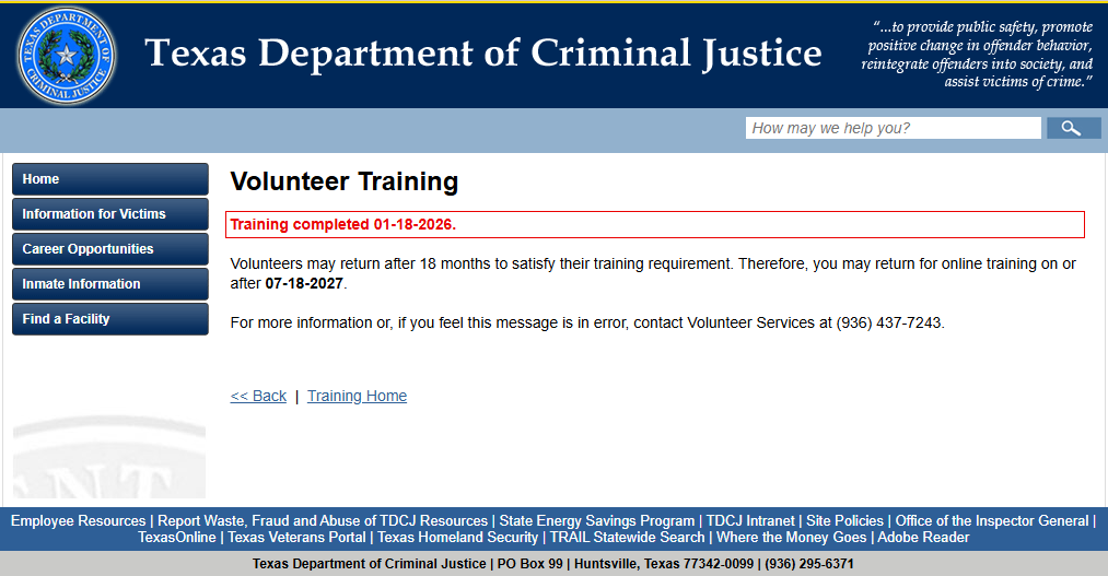 You may use the above link to check on your TDCJ Volunteer Training Date.